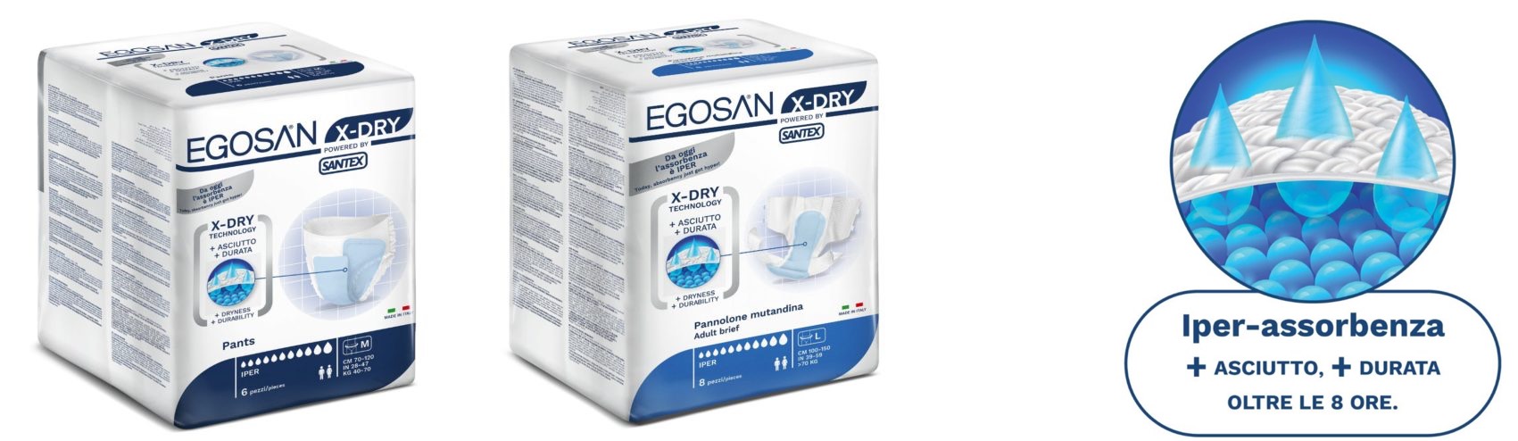 Santex è orgogliosa di presentare Egosan X-DRY. Grazie all’X-DRY Technology e al perfetto bilanciamento tra cellulosa di altissima qualità, capace di assorbire grandi quantità di liquidi, e polimeri super-assorbenti, in grado di trattenerli oltre 8 ore anche sotto forte pressione, i Pants e i Pannoloni X-DRY garantiscono un asciutto e una protezione mai visti prima.